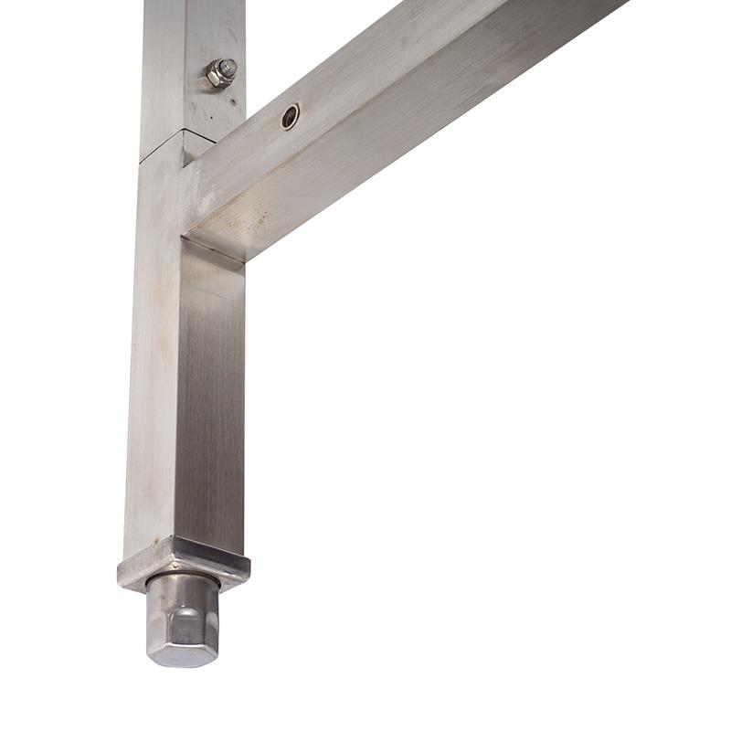 Für eine zusätzliche Stabilität sorgt die unter der Arbeitsplatte verbaute, schallhemmende Holzplatte. Die großzügige 800 x 600 mm große Arbeitsfläche ist mit 100 kg Tragfähigkeit äußerst belastbar. Bestehend aus Edelstahl ist sie besonders pflegeleicht und hygienisch - ideal z. B. für die Verarbeitung von Lebensmitteln. Mit den um 15 mm höhenverstellbaren Füßen arbeiten Sie auf Ihrer individuellen Arbeitshöhe, Bodenunebenheiten werden ausgeglichen. Nach Gebrauch lässt sich die glatte Edelstahl Oberfläche mühelos reinigen, das Gestell mit Scharnieren flink zusammenklappen. In komprimierter Form lässt sich dieser Edelstahltisch platzsparend lagern oder zu seinem nächsten Einsatzort transportieren.