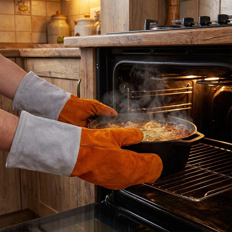 Hitzebeständigkeit und Robustes LederDie Ofenhandschuhe sind speziell entwickelt, um Temperaturen bis zu 250°C standzuhalten. Dank des hochwertigen Ledermaterials schützen sie Ihre Hände zuverlässig vor Verbrennungen durch heiße Töpfe, Pfannen oder Backbleche. Leder ist bekannt für seine hervorragende Isolationsfähigkeit und Strapazierfähigkeit, wodurch die Handschuhe nicht nur eine hohe Hitzebeständigkeit bieten, sondern auch langlebig und widerstandsfähig gegen Abnutzung sind. Das robuste Material bildet eine natürliche Barriere gegen Hitze und sorgt dafür, dass Ihre Hände auch bei längeren Kochvorgängen geschützt bleiben.
